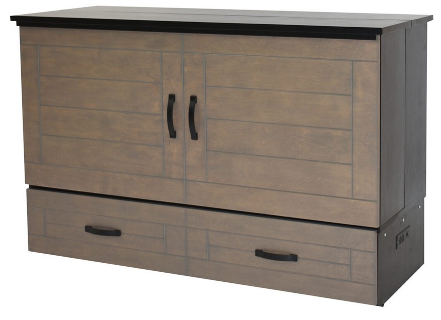 Metro Cabinet Bed The Metro Cabinet Bed transforms into a queen size bed in under 30 seconds, with no wall mounting or permanent installation required. Its sleek styling, clean lines and Pebble Grey panel with black all around give it a unique 2 tone look. By lifting the lid and opening side doors, it gives a nice open feeling to the bed.